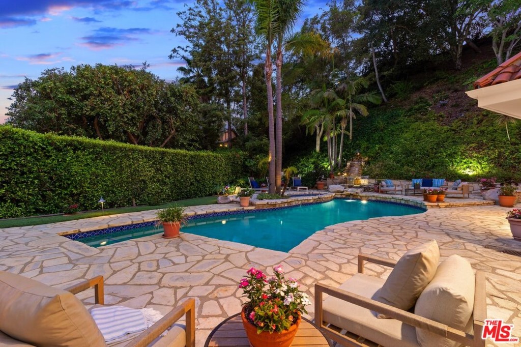PRICE IMPROVED BY OVER $1,000,000 WITHIN THE PAST MONTH - Perfectly situated North of Sunset on Lower Laurel Way in prime Beverly Hills, sits this beautiful, private and gated one-story Spanish retreat. Upon entering through double doors, you'll find the large open living area with high ceilings, and a stunning two-sided see-through Adobe fireplace. This home was crafted with a focus on light and open spaces with fine yet simple materials used to retain a sense of calm elegance. Glass French doors lead to the serene backyard, showcasing a sparkling blue pool, spa, waterfall, and lounge areas, all enveloped by soaring hedges and lush greenery for maximum privacy. Entertaining spaces include a living room with built-in bar, formal dining area, and large kitchen with an island and adjoining family room. Separate wing features a bright open primary bedroom with a walk-in closet, bathroom with double vanity, shower, and soaking tub, as well as the 2 additional en-suite bedrooms. Additional 4th bedroom/bathroom is off the kitchen. Set behind gates, the 3-car garage and motor court hosts up to 8 cars in total. A private, peaceful retreat in the most desirable Beverly Hills zip code and Beverly Hills School District.