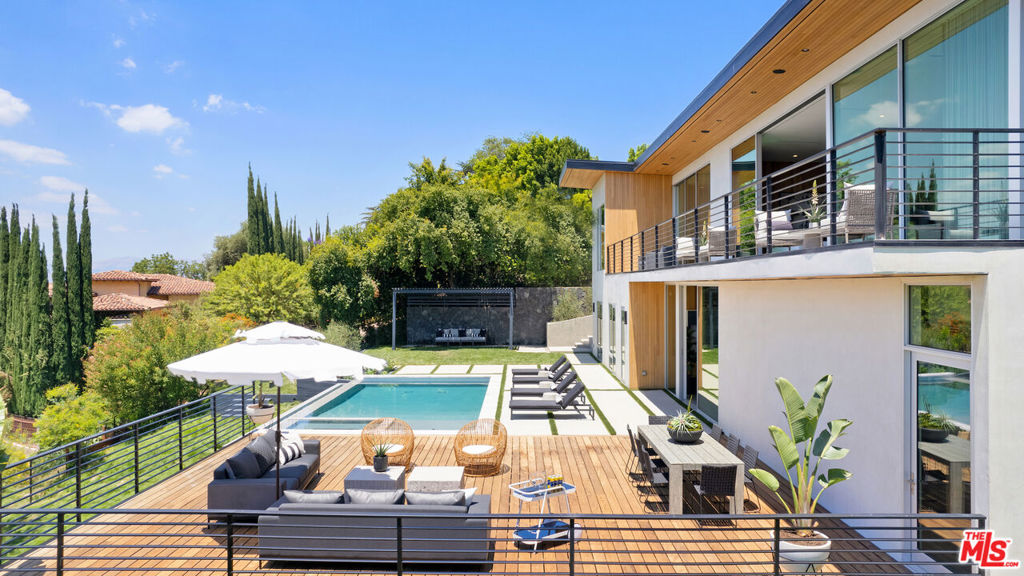 The latest gem in the Encino landscape is here. Enter the privately gated compound via the 'Ferris Bueller garage' or down the floating stairway over the Koi pond to the 10ft pivot entry door as unobstructed 180 degree views await. The latest multi million dollar development by Racing Green Group does not disappoint. Entering the main house you are met with incredible cedar and oak detailing set against the backdrop of some of the best views of the Encino Hills. Here you will find open plan living, dining and kitchen areas, as well as the Premier suite, two generous guest bedrooms, and maids rooms, all en suite, as well as a family/media room pre-wired with surround sound audio. The kitchen features hand crafted rift sawn white oak paneling set against elephant grey base cabinetry and delivers a stunning catering experience with 36" sink, Thermador and Wolf appliances, two dishwashers, and a separate Butlers kitchen and large walk in pantry. The premier bedroom boasting almost 1,000sf, continues to impress with large oak paneled walk in wardrobe, coffee station and beverage center, as well as a beautiful bathroom suite with some of the best views in the house. Descending to the lower ground floor the entertainment levels step up to reveal an expansive bar and games room, complete with TV wall, large private gym suite and two other en suite guest bedrooms which could also work as private office spaces. Outside the magic continues with panoramic views from the infinity pool, large Brazilian Ipe deck, large enough to deliver several outdoor dining and seating moments, as well as several large, flat grassy areas, and a steel framed Gazebo, all set amongst the back drop of unparalleled views.