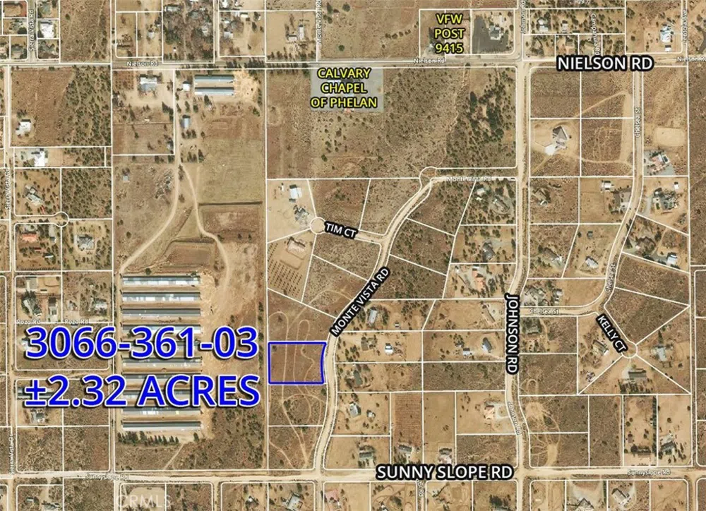 APN 3066-361-03 is a rectangular parcel on the west side of Monte Vista Road, north of Sunny Slope Rd. There are existing homes with power established across the street, buyer verify. Multiple Rural Residential Lots For Sale in the beautiful rural area of Phelan, San Bernardino County, CA. Enjoy spacious parcels with plenty of room for private, quiet living in an established rural neighborhood. Views of distant mountains to the south make this a desirable place to make a home. Quick access to grocery, conveniences and schools.